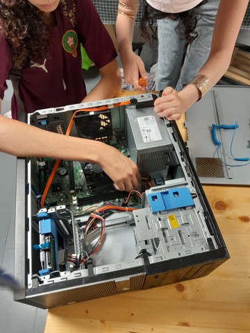 Pour la seconde partie, l’association a prêté du matériel, tours d’ordinateurs, outils, pour réaliser l’atelier. Ce qui a permis aux jeunes d’apprendre à nettoyer, démonter pièce par pièce (alimentation, disque dur, lecteur de disque, ventirad et processeur) puis à remonter toutes les pièces afin qu’ils aient les clés pour réparer leurs ordinateurs personnels sans avoir à racheter un ordinateur complet. Chaque étape du démontage sert aussi à apprendre les différents composants ainsi que leurs fonctions.